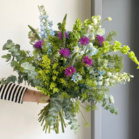 Playful, fresh, and full of life — Arles feels like a stroll through a blooming countryside meadow. With pops of purple, soft blue delphiniums, fresh greens, and airy eucalyptus, this bouquet has that just-picked, effortlessly natural charm.