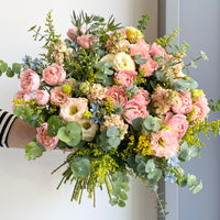 This Auckland bouquet is soft, full, and beautifully fresh! It blends pastel pink roses, creamy lisianthus, with pops of yellow blooms and delicate blue accents. The eucalyptus leaves give it a lush, natural look, while the mix of textures makes it feel rich and romantic.