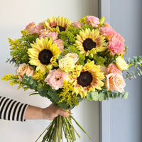 Bring pure sunshine into any room with Honolulu! This radiant bouquet combines cheerful sunflowers, soft blush roses, and delicate lisianthus, balanced with fresh greenery and pops of golden fillers. The result? A warm, uplifting arrangement that feels like a hug wrapped in flowers.
