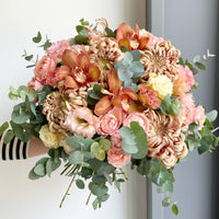 Warm, artistic, and utterly charming, Cuenca is a bouquet that feels like golden light spilling across an autumn afternoon. With earthy-toned cymbidium orchids, swirled bronze chrysanthemums, soft blush lisianthus, and peach-hued carnations, this bouquet blends sophistication with a touch of rustic romance. The eucalyptus weaves through gracefully, adding freshness and balance.