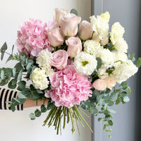 Nara is the embodiment of timeless beauty. The lush pink hydrangeas, delicate pastel roses, and creamy white lisianthus come together to create a bouquet that's as sweet as it is elegant. With eucalyptus for that fresh, calming touch, this arrangement makes the perfect gift for anniversaries, birthdays, or simply to brighten someone’s day.