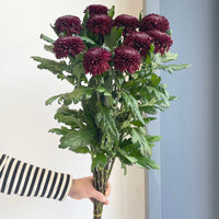 A bunch of 10 burgundy/purple pompon chrysanthemums, kind of an old fashioned flower - but these varieties are the next best thing to dahlias and but have nearly double the vase life!
