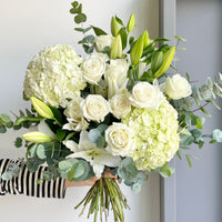 Clean, classic, and effortlessly beautiful — Ibiza is the bouquet that says less is more in the most luxurious way. A stunning blend of white roses, hydrangeas, and lilies, surrounded by soft eucalyptus greens, this arrangement radiates calm sophistication and quiet charm.