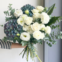 This stunning arrangement features a blend of soft white roses, lush hydrangeas, delicate lisianthus, and vibrant greenery, all beautifully wrapped together. It’s the perfect gift for someone special or a beautiful centerpiece to brighten up your home.