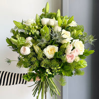 A bouquet that embodies peace, elegance, and natural beauty—Munich is a perfect harmony of white roses, delicate lilies, soft alstroemeria, and airy thistles, all nestled in lush greenery. The soft green accents and elegant whites create a calming, fresh look that works for every occasion, from weddings to thoughtful gifts or simply a moment of calm in your space.