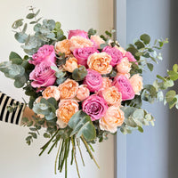 Our Sunset Garden Roses bouquet captures that magical feeling perfectly! Lush garden roses in stunning shades of vibrant pink and soft peach, with some showing those captivating deeper centers, are artfully arranged with fragrant eucalyptus, creating a truly enchanting display.