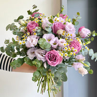 Step into the beauty of a spring garden with this enchanting bouquet! Bursting with lavender purple rose and camomile, it’s a dreamy mix that captures the essence of the season. Delicate greenery adds a fresh, natural touch, making it the perfect centerpiece for any room.