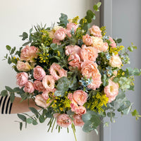 This Auckland bouquet is soft, full, and beautifully fresh! It blends pastel pink roses, creamy lisianthus, with pops of yellow blooms and delicate blue accents. The eucalyptus leaves give it a lush, natural look, while the mix of textures makes it feel rich and romantic.