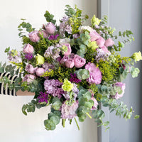 This Kansas bouquet is a dreamy mix of soft purples, lilacs, and greens. It features elegant roses, ruffled lisianthus, with pops of lime green and bright fillers to keep it lively. The eucalyptus leaves add a fresh, natural touch, making the whole arrangement look full and graceful.