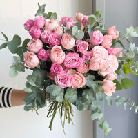 A bouquet that speaks the language of romance, Petra is a lush medley of blush and fuchsia garden roses paired with airy eucalyptus. The roses bloom with softness and depth, their petals unfolding like whispered secrets of love, while the eucalyptus adds freshness and a modern touch.