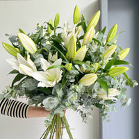 Our Adelaide arrangement is a floral masterpiece! This stunning mix features radiant white lilies with their captivating trumpet-shaped blooms, fragrant eucalyptus, and delicate textural accents.