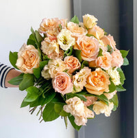 A lovely peach bouquet that has gorgeous Shimmer Peach roses, apricot lisianthus, and lemon leaves.