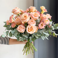 A vibrant bouquet that has Shimmer roses, with peach lisianthus, and fragrant eucalyptus.