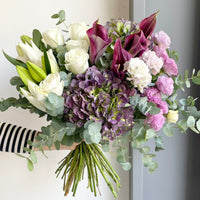 This elegant bouquet features rich purple hydrangeas, vibrant magenta calla lilies, delicate purple lisianthus, pristine white roses and lilies, all complemented by the subtle greenery of eucalyptus cinerea.
