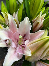 A really lovely pink, fragrant, oriental lily with a terrific vase life. The second photo shows how they look like once they start to bloom.