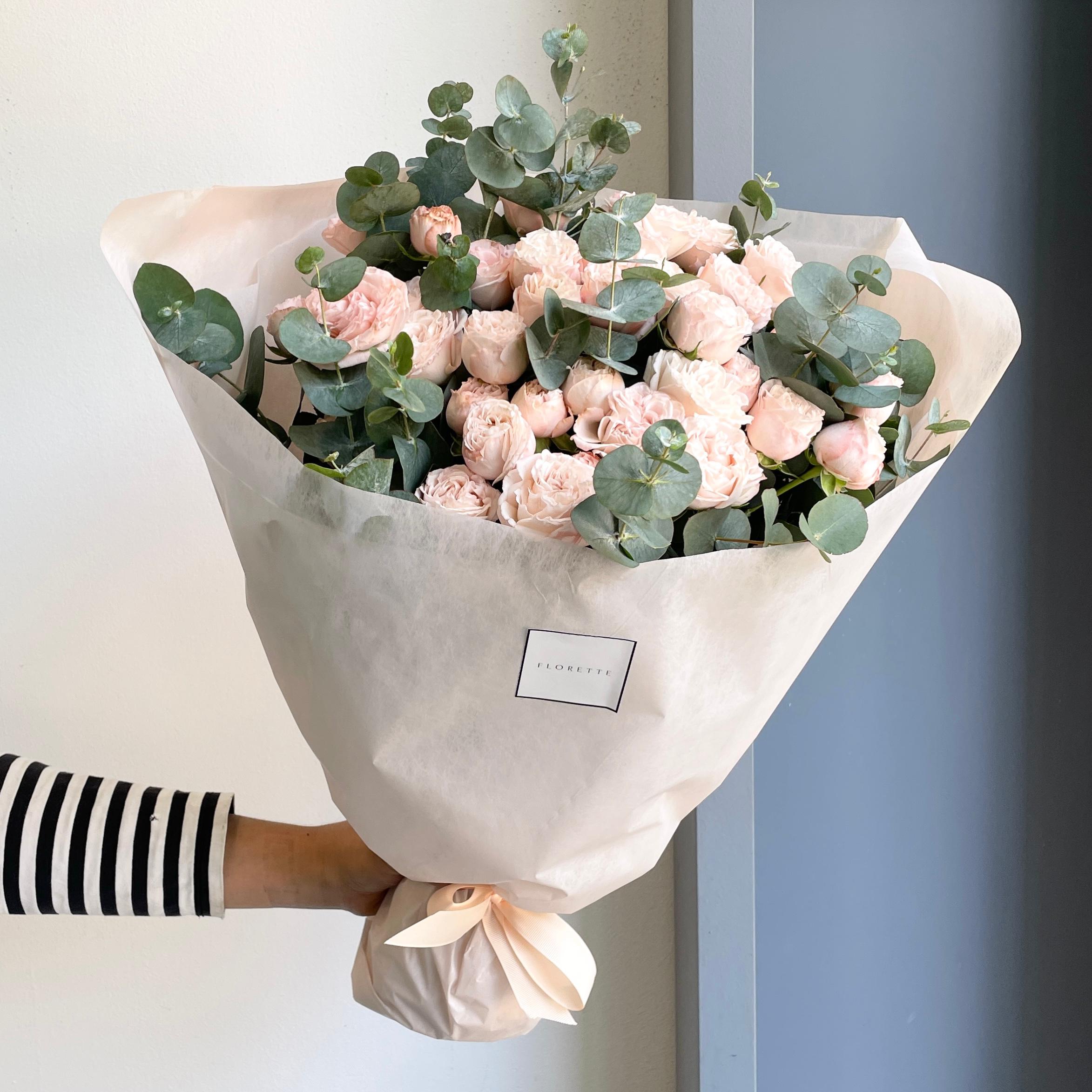 Subtle, sophisticated, and absolutely breathtaking. This bouquet of delicate peach-toned roses paired with fresh eucalyptus is the perfect blend of grace and charm.