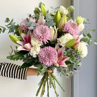 A bouquet that sings with charm and joy — Brovary is a graceful medley of pink lilies, chrysanthemums, white carnations, and eucalyptus. The delicate balance of soft pinks and creamy whites creates a look that’s both fresh and romantic, while a touch of thistle adds a unique twist of texture and personality.