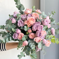 Soft, romantic, and utterly enchanting, La Paz brings together the charm of peachy blush garden roses with the elegance of lavender-toned roses, all nestled among fresh eucalyptus. The contrast of warm and cool tones creates a dreamy harmony—like a sunset meeting twilight.