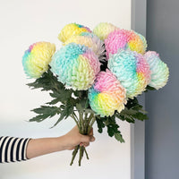 Important Disclaimer: Please note that these chrysanthemums are dyed to achieve their vibrant hue. Due to the dyeing process, some flowers may exhibit slight variations in color intensity, adding to their unique charm. This is not a defect but rather a characteristic of dyed flowers.